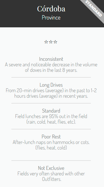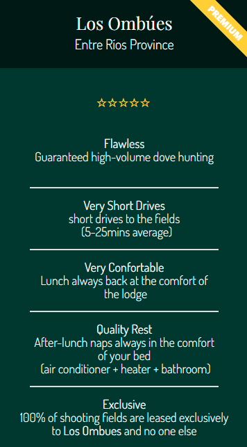 I’ve been going on South American bird hunts for the past 8 years, usually twice each year – nothing compares to Los Ombues Lodge. The staff is outstanding and cannot be more accommodating. You’ll will see more doves here in one day than at any other place and you will not be driving around for 30 minutes to over an hour each way to get to a hunt and then return to the lodge. Their equipment is all maintained perfectly. They have everything you need. The rooms are very nice and thoroughly cleaned several times each day. The food was great. You will also be very happy with the way they clean and maintain their firearms after every morning shoot and again after the evening shoot.